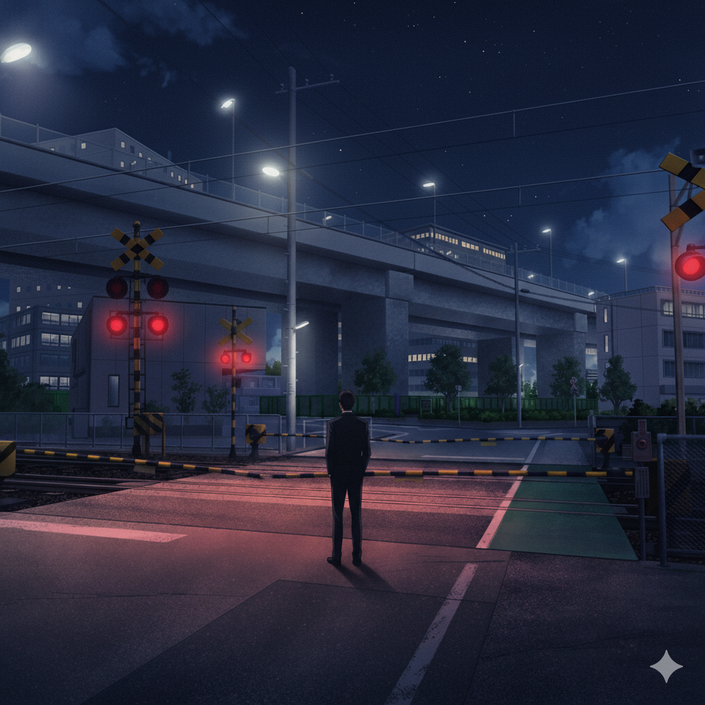 「またか…」電車が通過した後、すぐに反対側の電車が来て、踏切が異常に長く閉まったままになる。