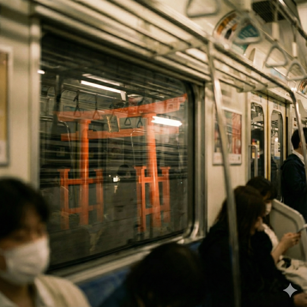 地下鉄の窓、暗闇に立つ鳥居。見ると大切なものを「落とす」