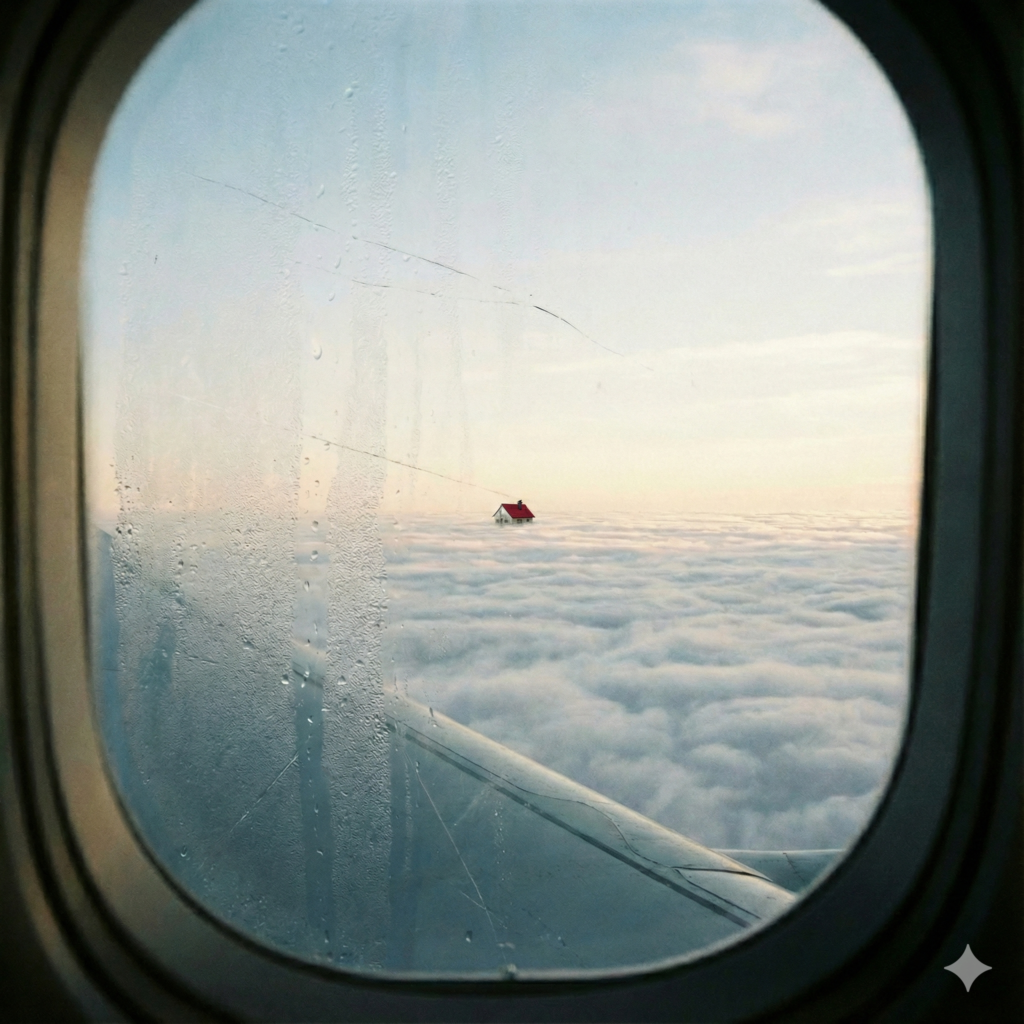 窓の外、雲の上に「家」が見える。直後の乱気流は警告か