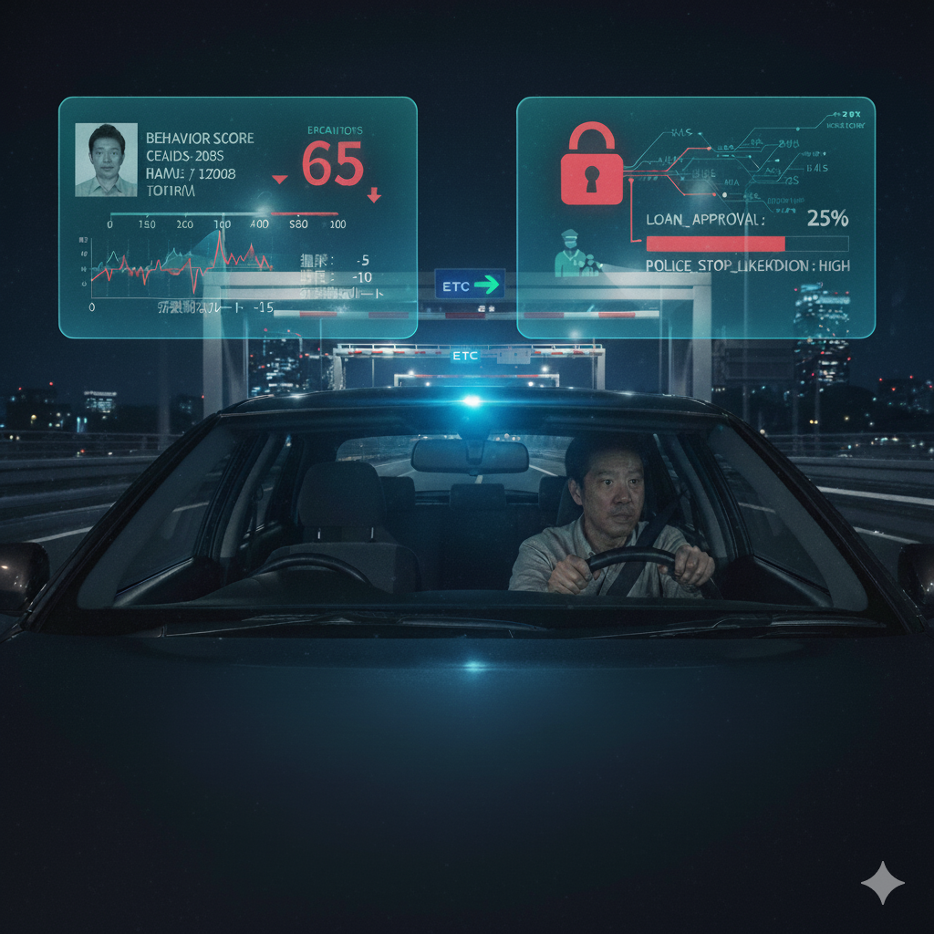 表向きは「交通量調査」だが、裏ではAIが全車両の「行動スコア」を算出している。「週末」「家族連れ」「観光地へ」向かう車は「協調的」として加点。「深夜」「単独」「不規則なルート」で走行する車は「非協調的」として減点される。