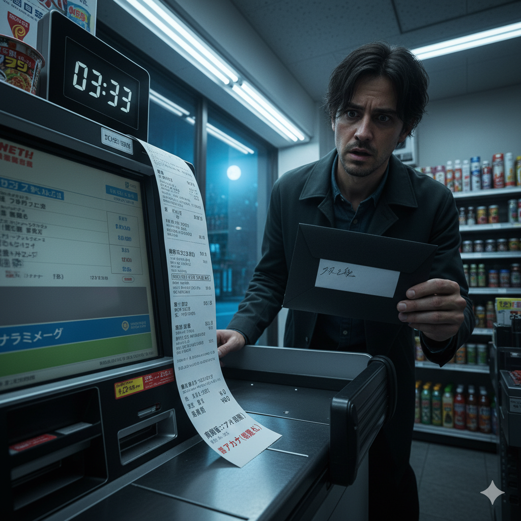 深夜3時33分。丑三つ時にとあるコンビニの新型セルフレジで会計をすると、稀に奇妙なレシートが出てくることがある。