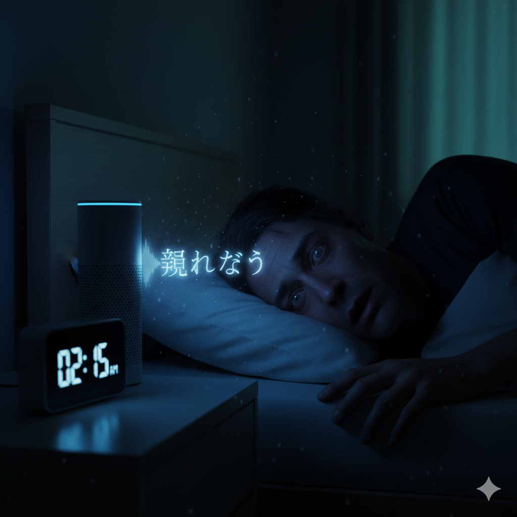 問題が起きるのは、その夜、あなたが寝静まった頃だ。深夜2時過ぎ、静かな部屋に、あのスマートピーカーから「録音されたあなたの声」で「晴れだよ」と囁きが。それはAIの返答ではない。昨日あなたが部屋で「明日は晴れだよな…」と呟いた独り言を、スマートスピーカーが録音し、今になって再生しているのだ。