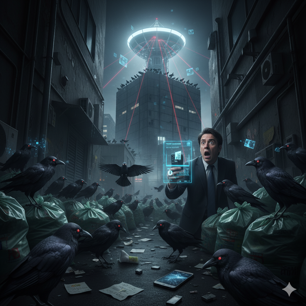 噂では、それらのカラスはある組織によって訓練・管理された「生体ドローン」。彼らの目的は、ターゲットが捨てた機密情報(メモ書き、レシート、破棄されたデバイス)の収集だ。 集められた「ゴミ」は、某所のビル屋上にある「巣(実は収集拠点)」に運ばれ、分析されている。